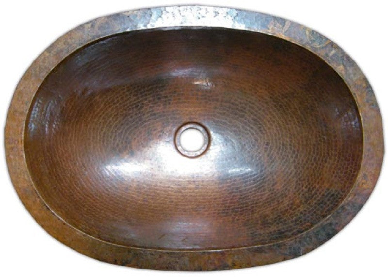 Mexican oval copper sink custom made with an optional drain-back system and patina color options. Copper bath sink "Torreon" can be installed as drop-in or undermount. Its surface is hammered and drain size standard for all bathroom sinks used throughout North America including Mexico, Canada and the US.